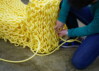 La série Obsession, du designer Kwangho Lee, se veut être une exploration de matériaux « pauvres ». Des tubes de PVC souple tressés génèrent ainsi une accumulation dans laquelle se dessinent des meubles et autres éléments fonctionnels.