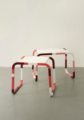 Cinq pièces, éditées en série limitée par la galerie, sont présentées: deux miroirs, une table basse, un banc et une arche lumineuse. Simples mais sophistiquées, en courbe et en légèreté, elles dialoguent entre elles et avec l’espace qui les accueille, le faisant raisonner d’une manière particulière, générant une tension douce mais perceptible.