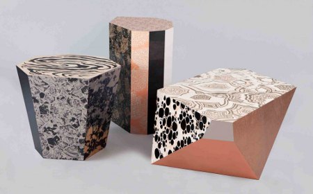 Durant la Dutch Design Week, la designer Hannah Sabapathy, récemment diplômée du Royal College of Art de Londres, expose sa série de tabourets-tables basses Soft Edges. Avec leurs formes vives et sculpturales, les pièces présentées possèdent également des faces à chaque fois différentes: en cerisier, en planches de MDF imprimés, laqués, rehaussés à la feuille d’or et d’aluminium, ou encore de contreplaqué gravé de motifs.