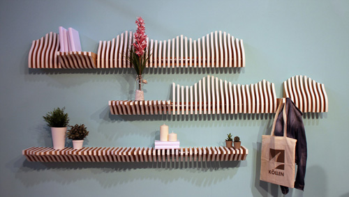 Composées de lamelles de bois désolidarisées les unes des autres, elles peuvent être placées indépendamment en fonction des usages et des objets qu’elles accueillent. Adaptable, la structure de Köllen naît de la répétition de pièces de tailles variables qui créent une subtile courbe. Ces tasseaux de bois brut évoquent immédiatement le style scandinave, avec ses tons clairs et quelques nuances de blanc. La forme délicatement sinueuse de ce pièces de bois évoque selon ses créateurs les montagnes, clin d’œil que l’ont retrouve jusque dans le nom du projet puisqu’en suédois, Alpes se dit Köllen.