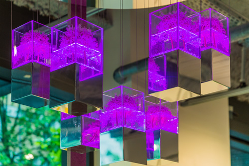 Afin de s’adapter aux contextes et aux différents environnements, ces lustres embarquent une technologie qui permet via une application mobile de jouer avec l’intensité lumineuse et de modifier les couleurs du lustre.