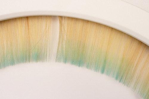 Cette horloge s’affranchit d’aiguilles et ce sont les fibres qui oscillent délicatement pour indiquer le temps. Une à une, les fibres se redressent en silence, créant des vides permettant de lire l’heure de manière presque classique, mais dans une approche douce, permettant de contempler le temps qui passe plutôt que de le subir.