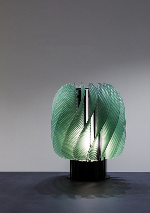 L’installation Horah s’inspire d’une danse du même nom, originaire des Balkans pratiquée dans de nombreux pays. Pour le duo de designers Raw Edges, tous deux originaires d’Israël, cette danse est associée à la tradition, à leurs origines. Les 30 luminaires sont disposés sur une grande plate-forme courbe au centre de la galerie. Chacune des lampes se parent de feuilles de verre courbées, qui sont reliées à un moteur pivotant. La lumière, dissimulée au centre filtre faiblement en créant un gradient lumineux qui se diffuse dans les feuilles de verre.