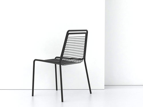 Ces deux courbes sont faites de tubes d’acier qui viennent créer les deux cadres qui une fois soudés, donnent naissance à l’assise. Des tiges de métal plus fines s’invitent entre les cadres pour venir former les dossier et la surface d’assise. Une silhouette légère au profil simple et pur, qui a été pensé pour une utilisation en intérieur comme à l’intérieur.